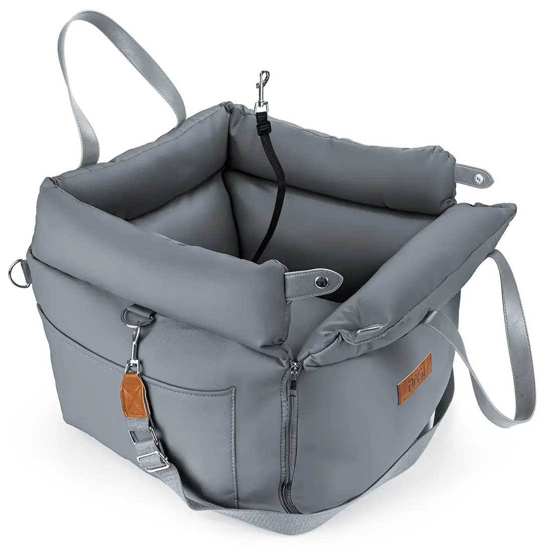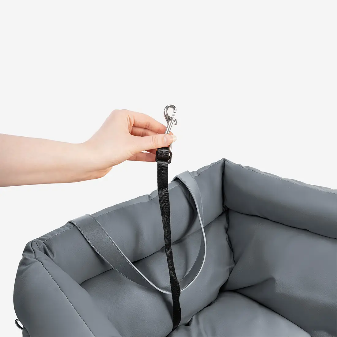 Dzięki regulowanemu paskowi na zagłówek oraz haczykom z tyłu, fotelik stabilnie utrzymuje się na miejscu. Wbudowana smycz z karabińczykiem pozwala bezpiecznie przypiąć pupila do szelek.