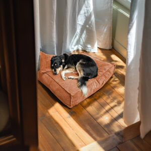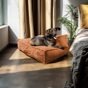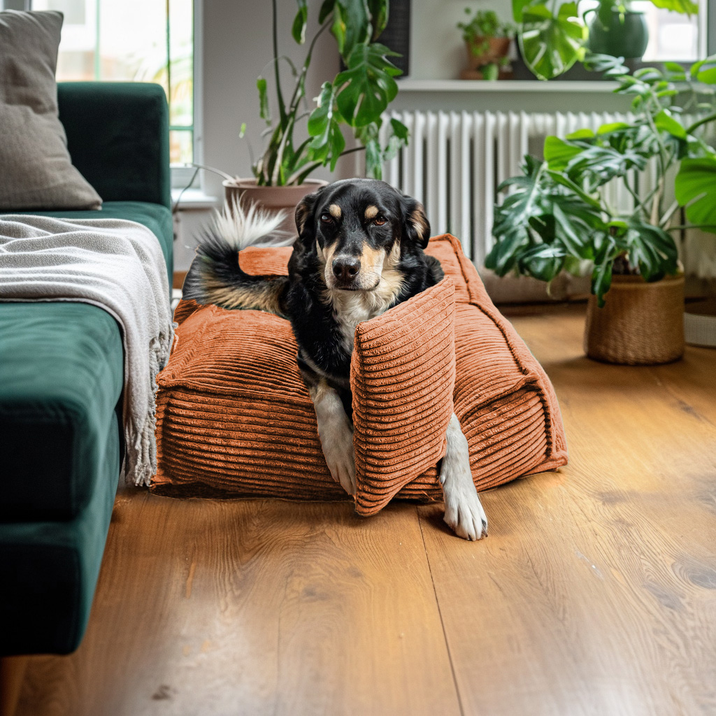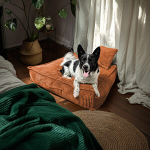 - Wyrazisty, modny kolor – rudy sztruks tapicerski ożywia przestrzeń, tworząc przyjazne miejsce wypoczynku dla psa.
