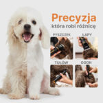 Idealne do pielęgnacji wrażliwych i trudno dostępnych obszarów – takich jak łapki, pyszczek, uszy czy ogon. Jego konstrukcja pozwala na pewne i bezpieczne manewrowanie, gwarantując idealnie przyciętą sierść bez ryzyka podrażnień.