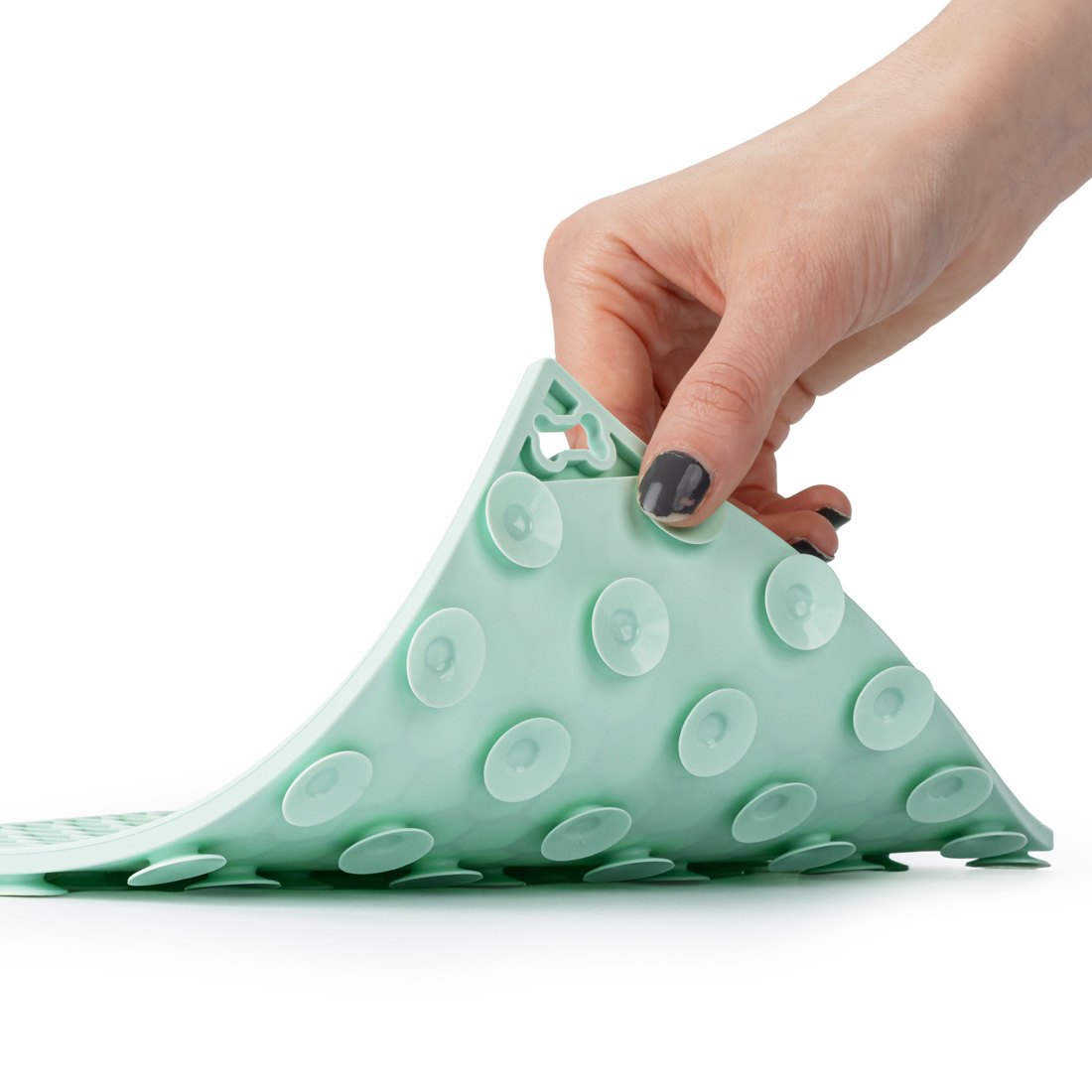 Dzięki przyssawkom na spodzie, matę przyjmujesz do bocznej ściany wanny lub lodówki — to stabilne mocowanie zmienia zasady gry przy pielęgnacji pupila.