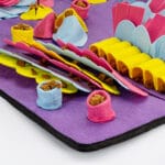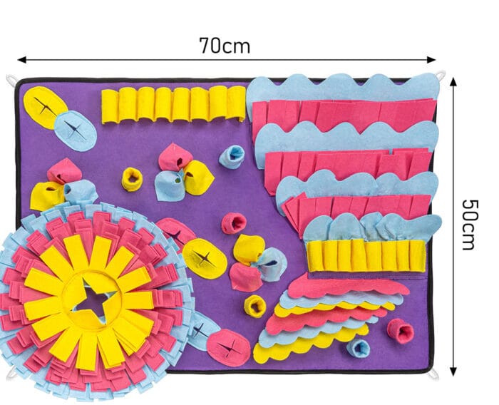 Duża, wygodna mata węchowa edukacyjna o rozmiarze 70 x 50 cm zarówno dla dużego jak i małego psa, szczeniaka a nawet królika. Wykonana z miękkiego materiału ze skrytkami o zróżnicowanym stopniu trudności.