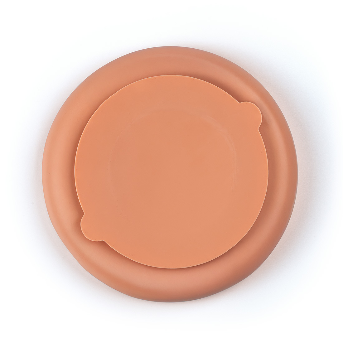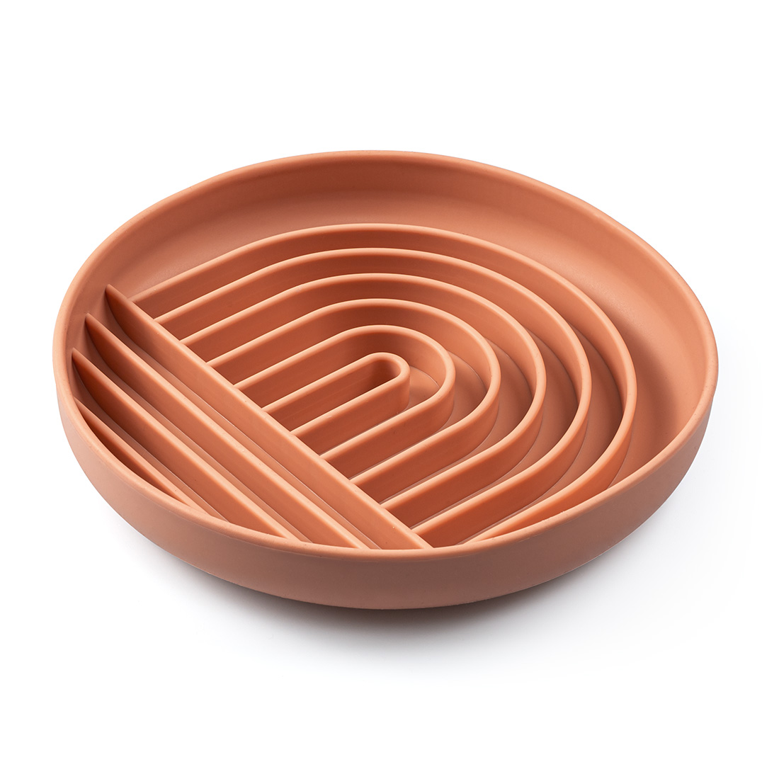Pastelowa, silikonowa taca Ragi o średnicy 19 cm ma w środku gęsty labirynt pionowych ścianek, który wymusza precyzyjne wybieranie kęsów pokarmu — a od spodu trzyma się podłogi dużą przyssawką.