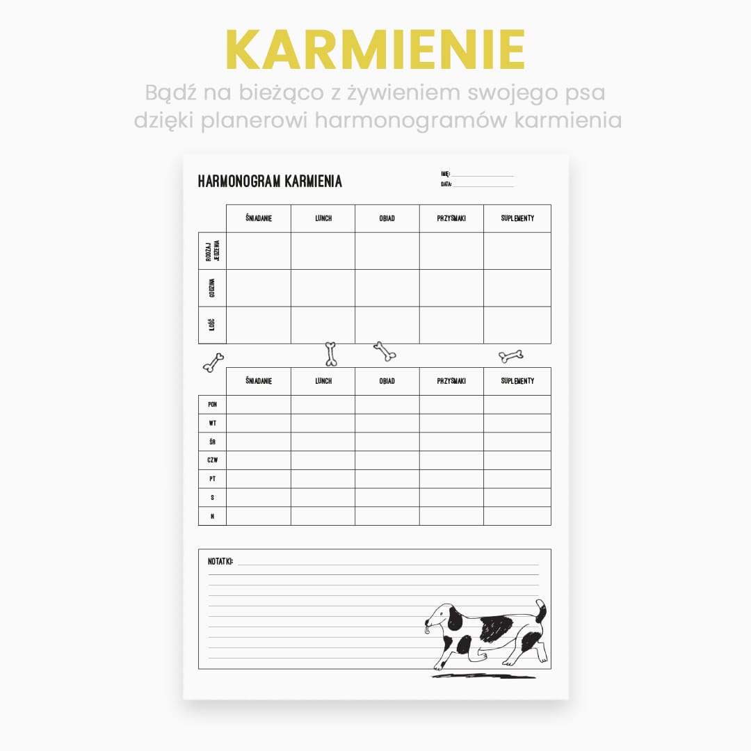 Harmonogram karmienia – planuj posiłki, monitoruj ilość karmy i dostosowuj dietę do potrzeb psa.