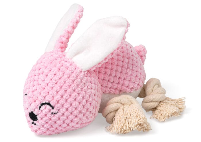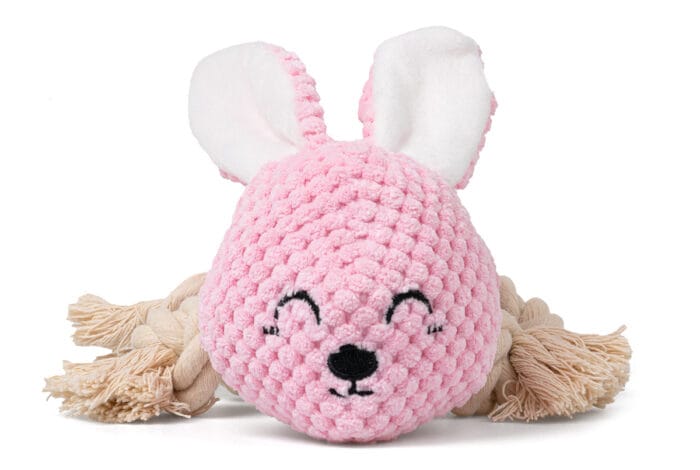 Wytrzymały różowy pluszowy królik z piszczałką dla psa jest świetnym sposobem na aktywność fizyczną. Przystosowany do szarpania, rzucania, aportowania, pluszowy królik to piszcząca zabawka, która działa!