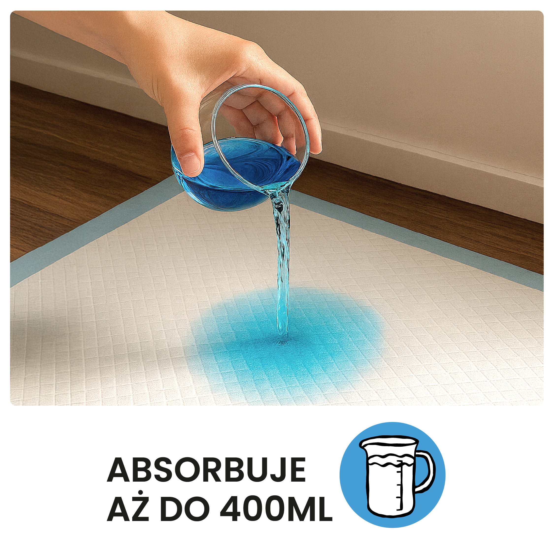 Specjalne mikrowłókna i absorbent (SAP) zamieniają ciecz w żel, zamykając wilgoć głęboko wewnątrz podkładu. Powierzchnia pozostaje sucha, a łapki Twojego pupila czyste.