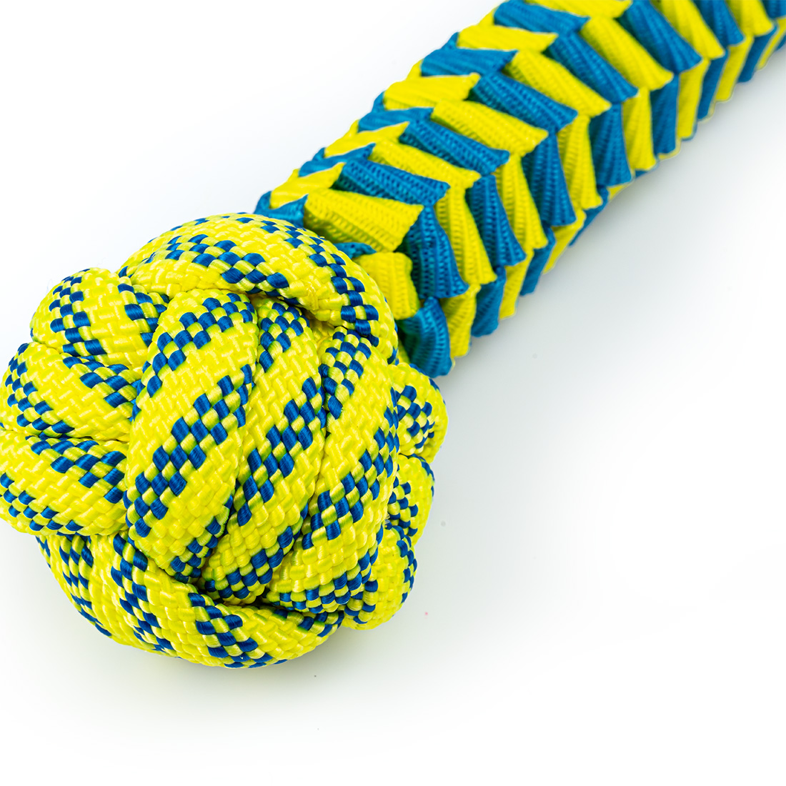 Kula pełni też rolę wyraźnego punktu chwytu dla psa. Pies widzi jasno, gdzie ma złapać, co ułatwia naukę aportu i buduje pewność w siłowaniu. Gdy już ma kulę w pysku, karbowana plecionka działa jako naturalna szczoteczka — masuje dziąsła i ściera osad z zębów.