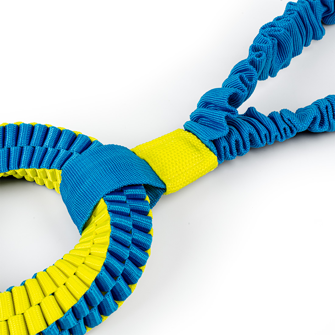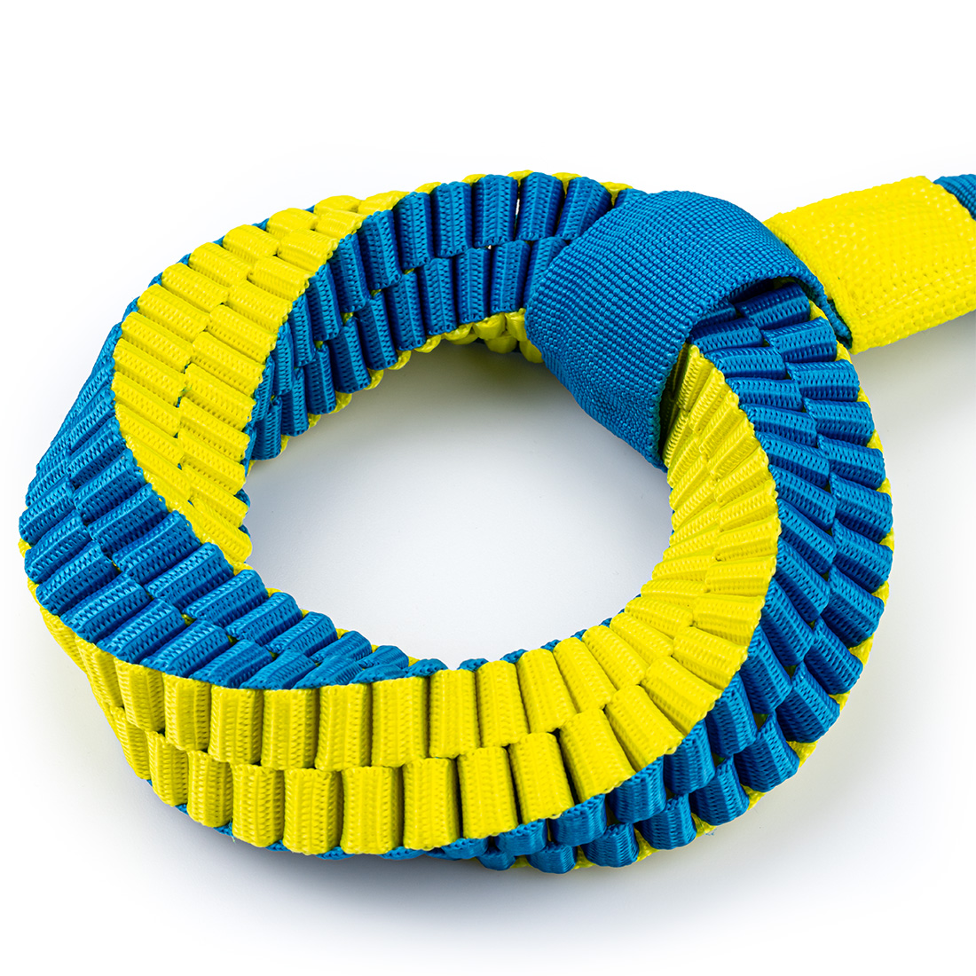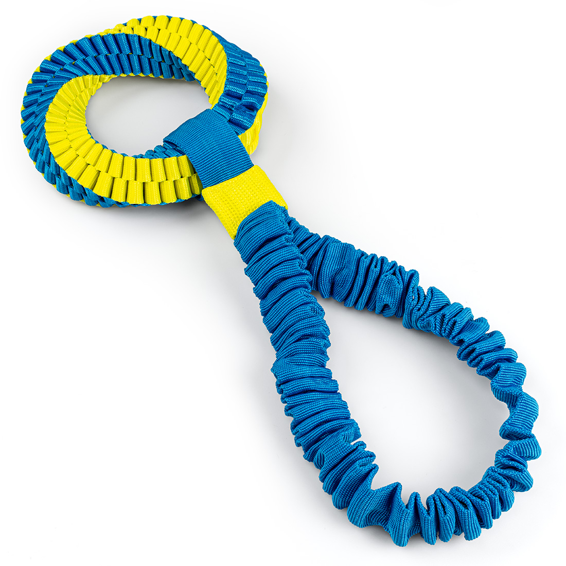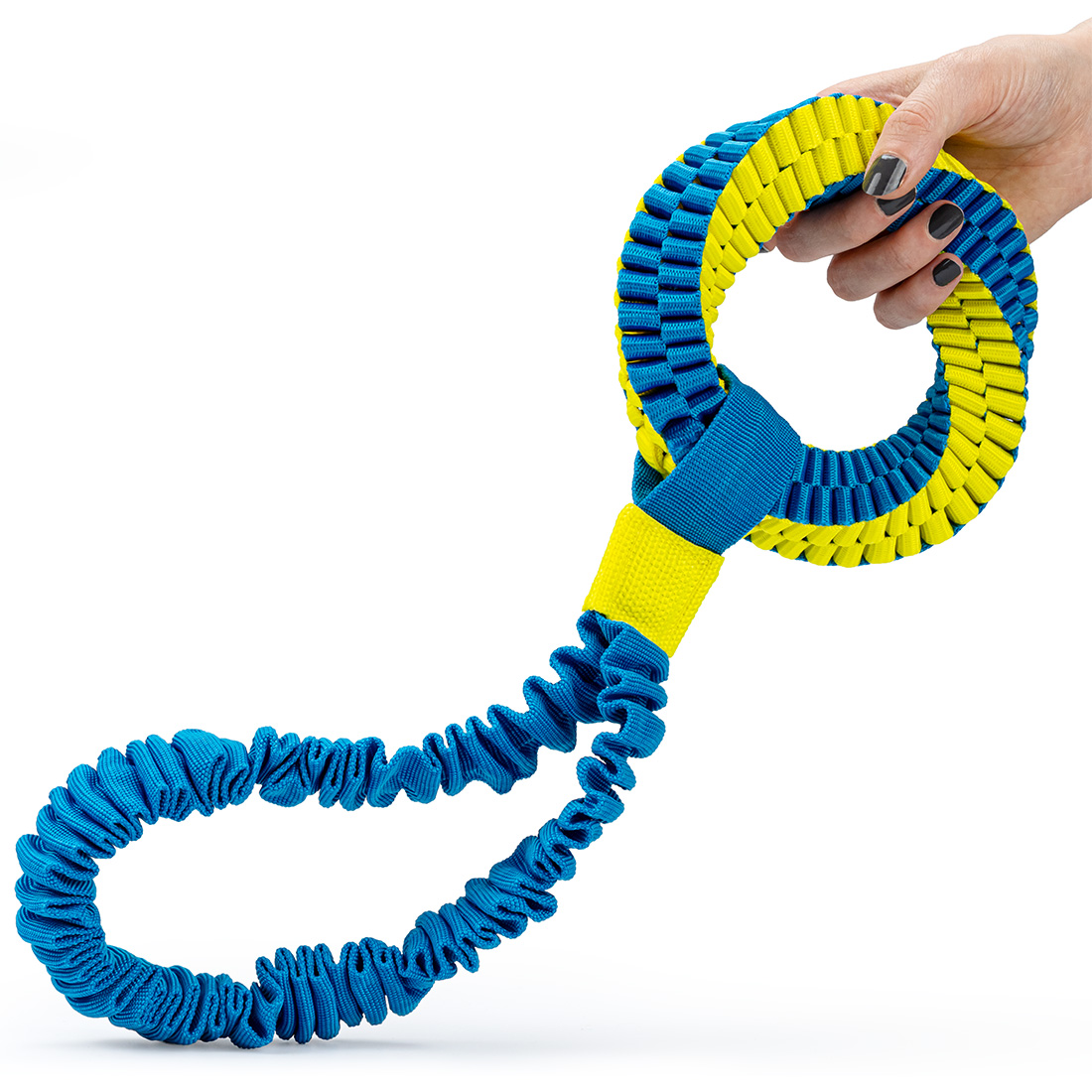 Możesz dynamicznie odciągać zabawkę, budując u pupila większą motywację do pogoni, a gdy pies złapie koło — amortyzator pozwoli mu na naturalne, sprężyste szarpanie.
