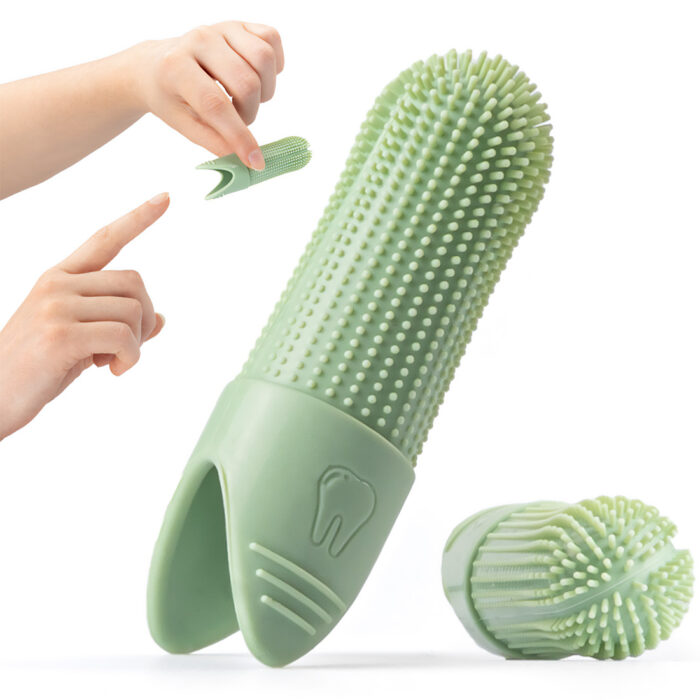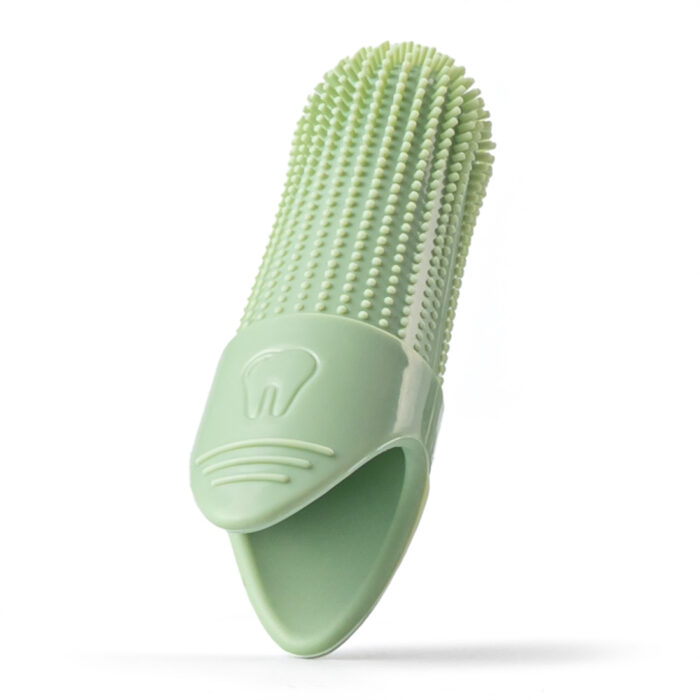 Miękka szczoteczka z silikonu klasy human-grade, zakładana na palec, ułatwia codzienne czyszczenie zębów oraz pielęgnację dziąseł u psów i kotów.