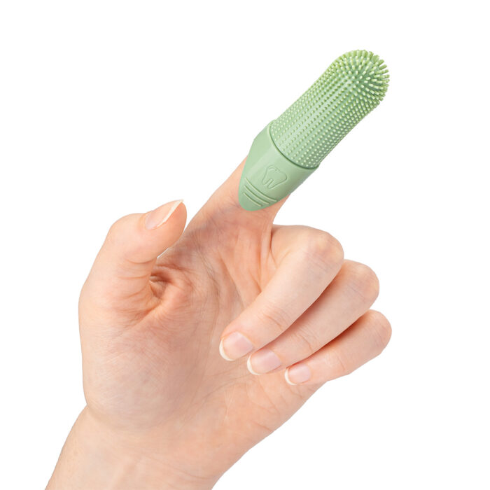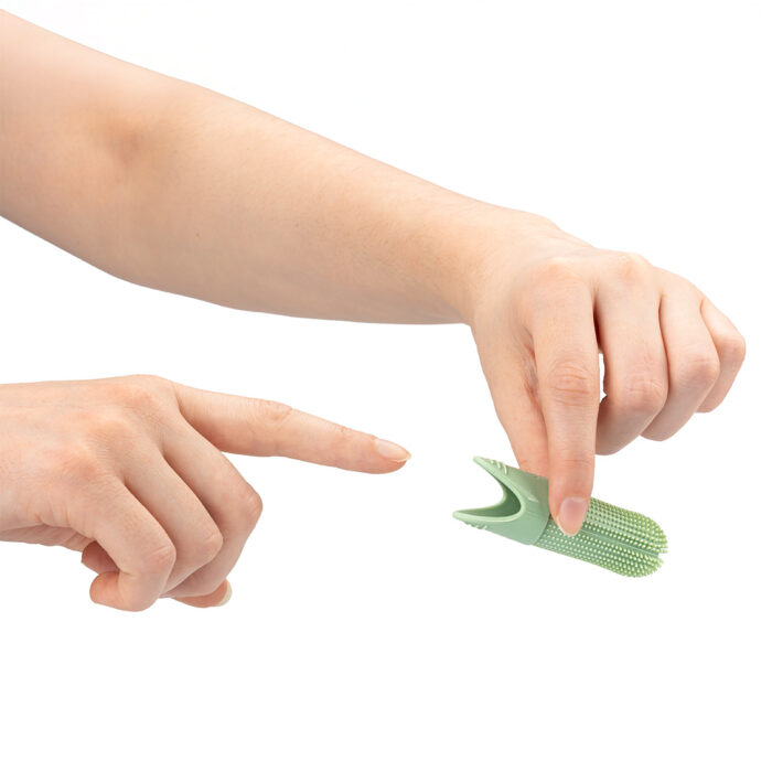 Forma nakładana na palec umożliwia kontrolę nacisku i ruchu, co ułatwia dotarcie do trudno dostępnych miejsc oraz delikatny masaż dziąseł, szczególnie u młodych zwierząt.