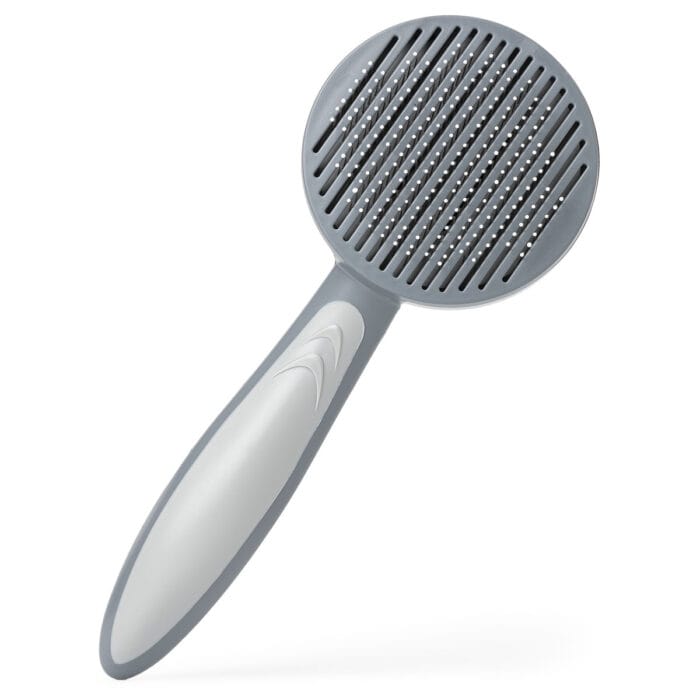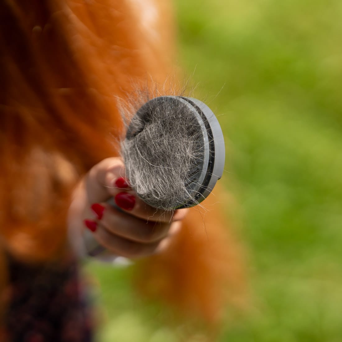 - ERGONOMICZNY KSZTAŁT – okrągła końcówka szczotki samoczyszczącej pozwala wyczesywać sierść z delikatnych, trudniej dostępnych miejsc.